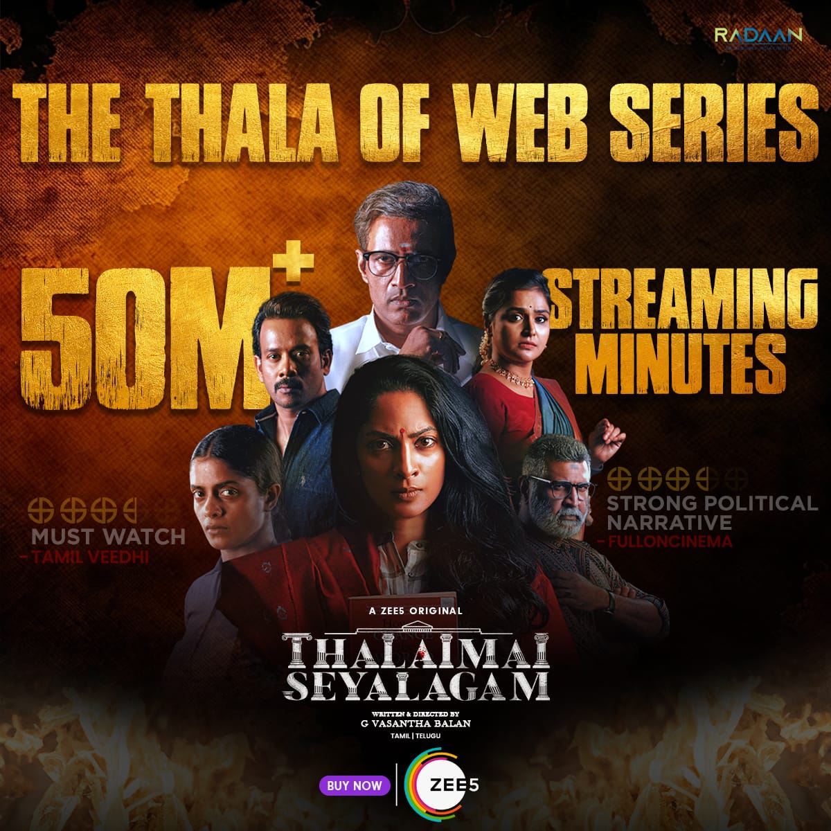 இந்தியாவின் முன்னணி ஸ்ட் ரீமிங் தளமாக, ரசிகர்களால் கொண்டாடப்படும் Zee5 தளத்தில், சமீபத்தில் வெளியான ‘தலைமைச் செயலகம்’ சீரிஸ், 50 மில்லியன் பார்வை நிமிடங்களைக் கடந்து, சாதனை படைத்துள்ளது.