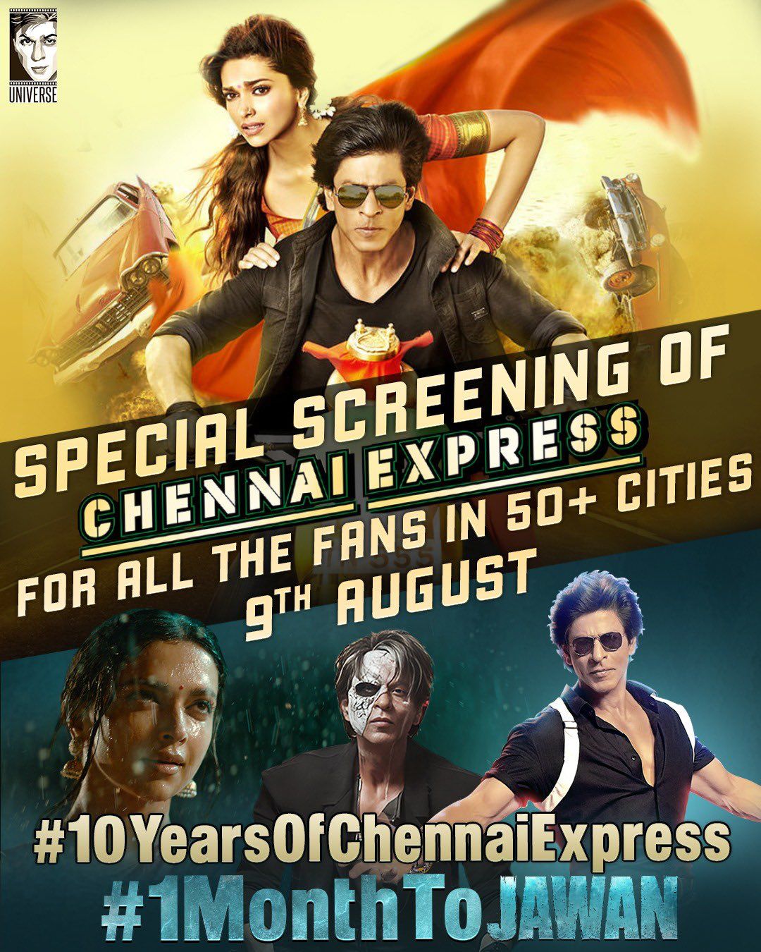 சென்னை எக்ஸ்பிரஸ் திரைப்படம் வெளிவந்து 10 ஆண்டுகள் நிறைவடைந்துள்ள நிலையில், ஷாருக்கான் யுனிவர்ஸ், ஜவான் திரைக்கு வரும் வரை, 52 நகரங்களில் ஒரு மாதத்திற்கு சென்னை எக்ஸ்பிரஸ் சிறப்புத் திரையிடலை நடத்த உள்ளது.